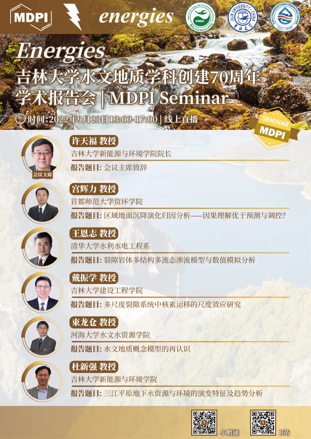 正值吉林大学水文地质学科 (原长春地质学院水工系) 创建70周年之际,Energies期刊携手bat365官网登录入口特别邀请到学院院长许天福教授担任会议主席,并邀请首都师范大学宫辉力教授、清华大学王恩志教授、吉林大学戴振学教授、河海大学束龙仓教授,以及吉林大学杜新强教授,围绕水文地质学的相关研究进展为大家带来精彩的学术报告。