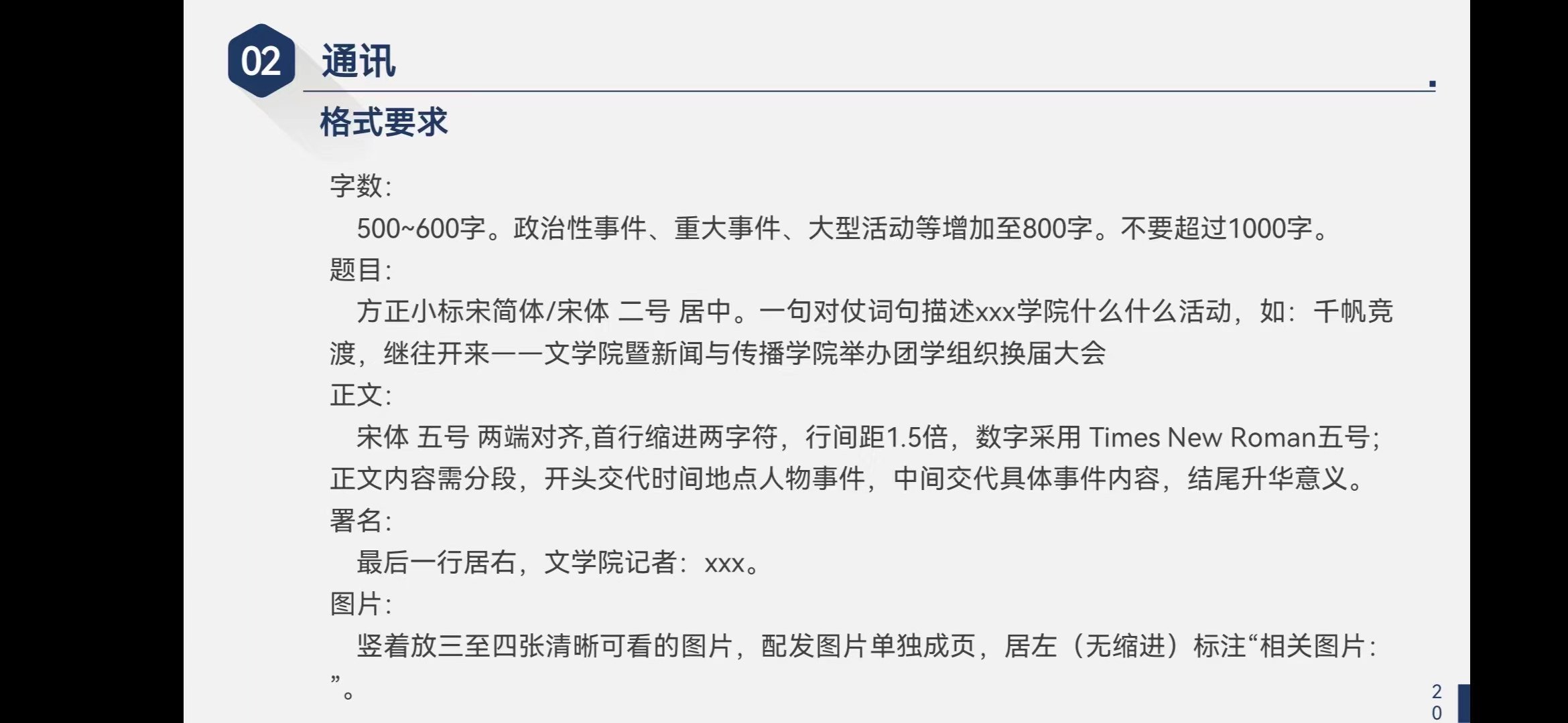 与此同时,陈实同学还为大家介绍了通讯稿中不可或缺的新闻摄影,注重讲解了六种常用的构图法和一些在拍摄及选用照片时极易忽略的要点。最后,陈实同学叮嘱同学们,无论是未来的新闻工作者,还是如今团学组织的一员,面对工作都应秉持着严谨细致、认真负责、恪尽职守的态度,当代青年人生逢其时,既要志存高远更要脚踏实地,从最基本的工作中不断学习,踏踏实实做好每件“小事”才能在实现家国梦想的道路上播种更绚丽的花朵。