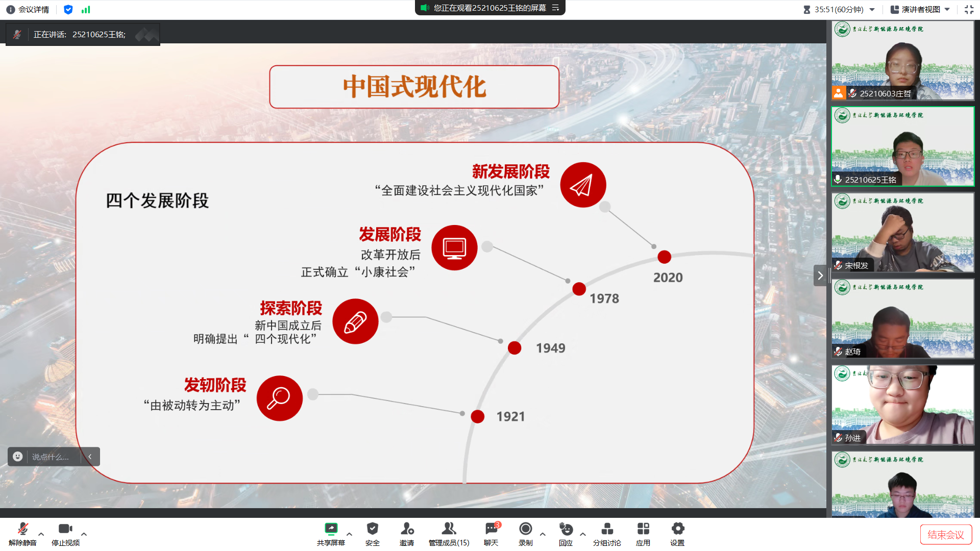 看过视频后,王铭同学为同学们讲解了何为“现代化”,“现代化”这一概念发源于西方,是指社会从农业社会向工业社会转变的历史过程。现代化的概念虽从西方舶来,但不是颠扑不破的真理。我国在进行现代化探索的过程中,既学习西方现代化的先进做法和新鲜经验,又结合我国发展的具体实际,打破了“现代化=西方化”的迷思,逐步走出一条不同于西方模式的、适合中国国情的中国式现代化道路。