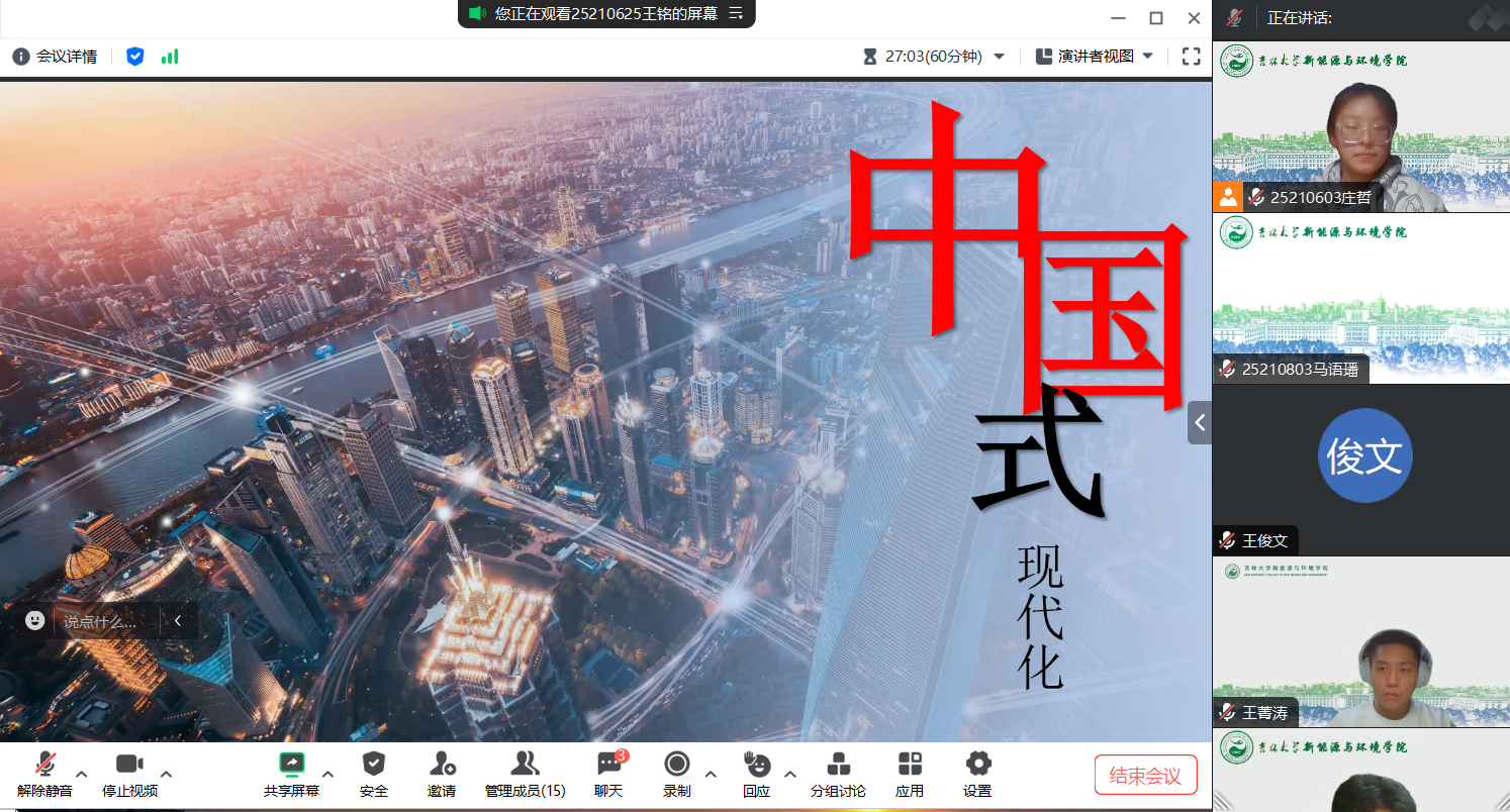 会议开始,班长王铭从一则短视频出发,带领全班同学直观感受中国式现代化的丰富图景,通过观看视频,同学们体悟到在党的坚强领导下,一幅幅生动的现代化画卷正在神州大地徐徐展开。