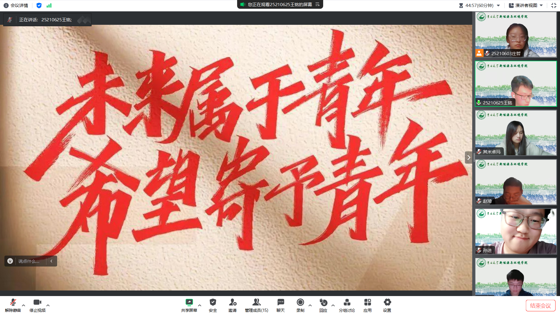 随后,王铭同学依次向同学们讲解了“中国式现代化”的发展历程、“中国式现代化”的重要特征、中国式现代化战略安排“两步走”。同学们纷纷表示要树立奋斗目标,坚持发扬斗争精神,为实现自己的人生价值努力奋斗,不断追求自己的梦想,全力战胜前进道路上各种困难和挑战,为实现中国式现代化的目标贡献自己的力量。