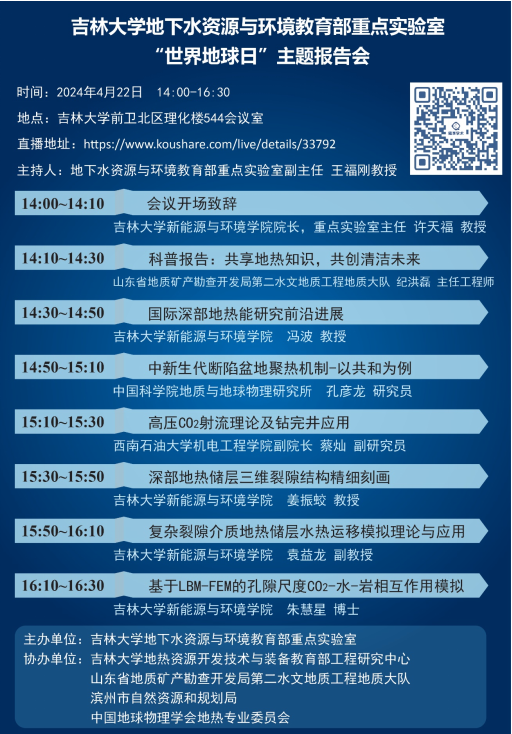 2024年4月22日是第55个“世界地球日”,主题为“全球战塑”(Planet vs. Plastics)。今年的世界地球日主题报告会活动由“地下水资源与环境教育部重点实验室主办,吉林大学地热资源开发技术与装备教育部工程研究中心、山东省地质矿产勘查开发局第二水文地质工程地质大队、滨州市自然资源和规划局、中国地球物理学会地热专业委员会联合协办”,蔻享学术网络平台提供直博服务。报告主题围绕应对全球气候变化的国际关注热点问题,分别从绿色能源-地热能开发,以及二氧化碳减排地质封存两方面进行科普宣讲和学术研讨。会议由地下水资源与环境教育部重点实验室副主任王福刚教授主持,重点实验室成员及研究生50余人线下参加此次学术交流活动,6000余人通过“蔻享学术”平台直播观看了此次报告会。