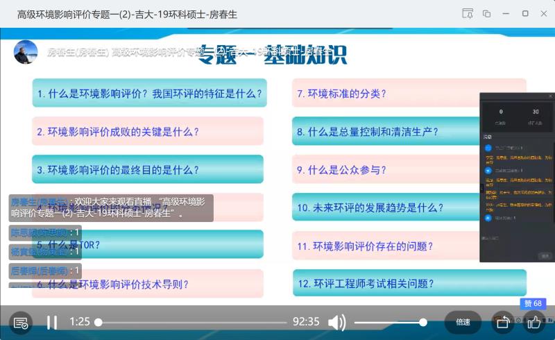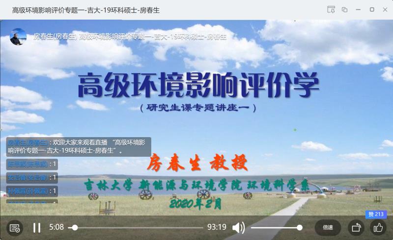 根据学校工作部署和《bat365官网登录入口疫情防控期间研究生工作安排》的文件要求,我院2019-2020学年第二学期部分研究生课程改为线上教学结合群讨论的形式授课。2月26日上午8时,我院房春生教授开设的环境科学专业硕士研究生专业课《高级环境影响评价学》顺利进行了首次网络直播授课,成为我院第一门在线直播授课的研究生课程。