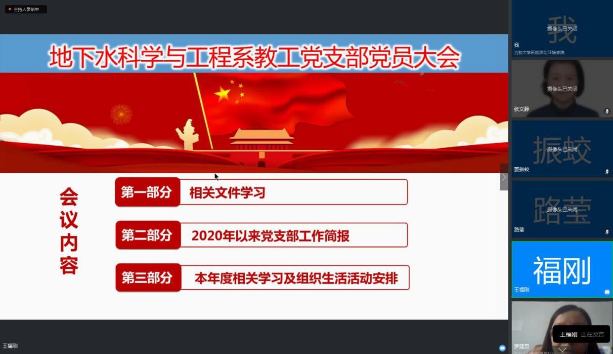 为了积极响应和落实吉林大学在疫情期间的各项工作任务,地下水科学与工程系教工党支部于2020年4月29 日召开了支部全体党员大会,会议采用在线视频会议形式进行。会议包括三方面内容:分别是政治理论学习、本支部2020年度以来特别是疫情期间的的阶段性工作情况汇报、以及2020年度支部工作安排。