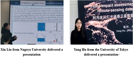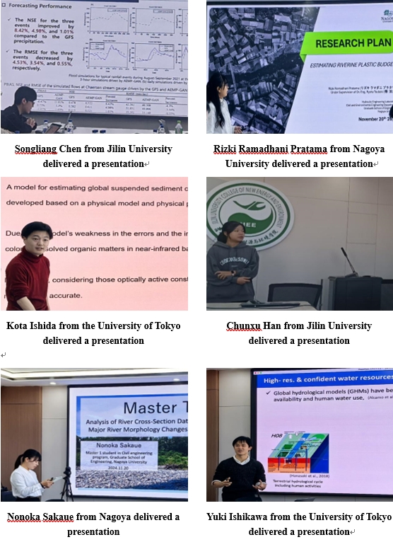Six presentations were delivered on the workshop, including "Deep Leaning-Based Correction Method for Global Precipitation Forecasts" presented by Songliang Chen from Jilin University, "Estimating Riverine Plastic Budget in Brantas River, Indonesia" presented by Rizki Ramadhani Pratama from Nagoya University, "Developing a Satellite Image-Based Model to Estimate Suspended Sediment Concentration in Global Rivers" presented by Kota Ishida from the University of Tokyo, "Variations in the Streamflow of the Nierji Reservoir Basin and Quantification of the Influencing Factors" presented by Chunxu Han from Jilin University, "Analysis of River Cross-Section Data for Clarifying the Cause of Major River Morphology Changes by Floods in a Gravel River" presented by Nonoka Sakaue from Nagoya University, "Assimilation of Remotely-Sensed Discharge into a Global Water Resources Model" presented by Yuki Ishikawa from the University of Tokyo, "Numerical Simulation of Wave-Induced Scour in Front of Vertical and Inclined Breakwaters" presented by Xin Liu from Nagoya University, and "Flood Impact Assessment Using Nighttime Light Remote Sensing Data" presented by Dr. Yang Hu from the University of Tokyo.
